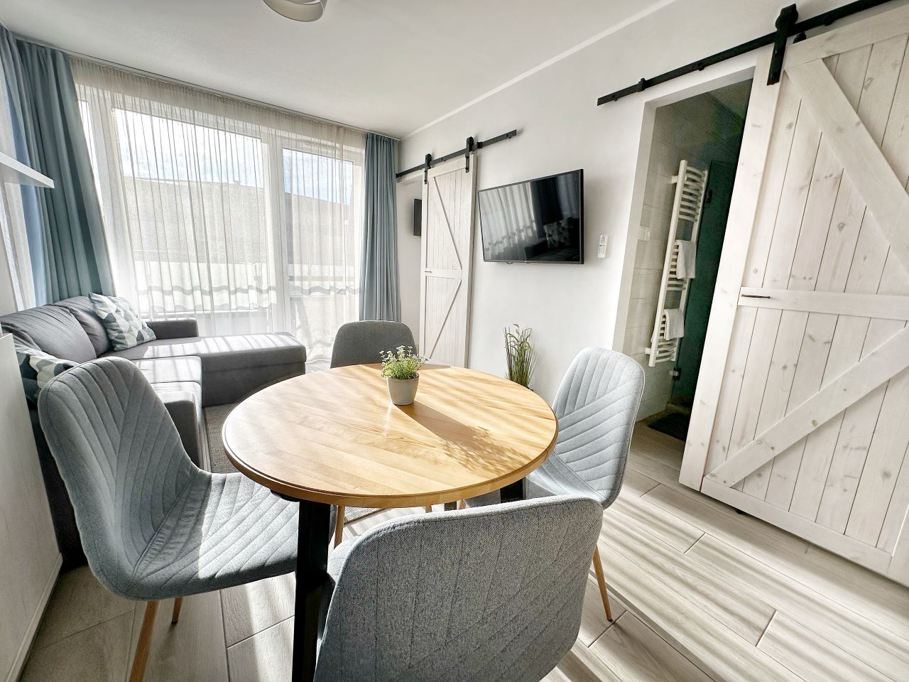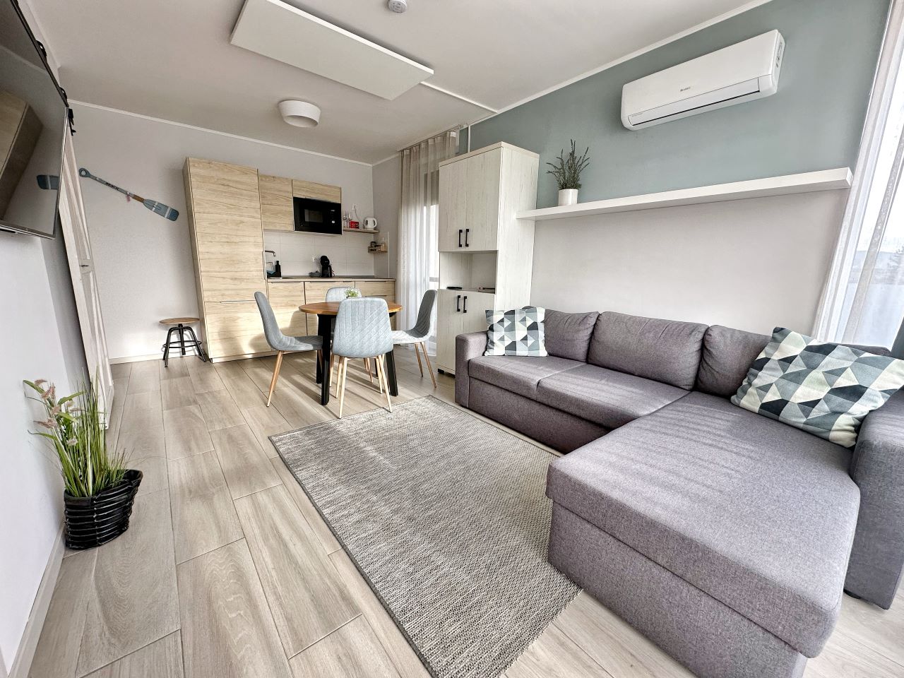 A Dora holiday house- emeleti aparmanja, tágas napozó terasszal, 2 hálószobával, 4 külön ággyal, felszerelt konyha, klíma, fűtés, mosógép, 2 kerékpár – ingyenesen használhatók, minden szobában TV, Netflix Wifi, ingyenes parkolás a ház előtt.